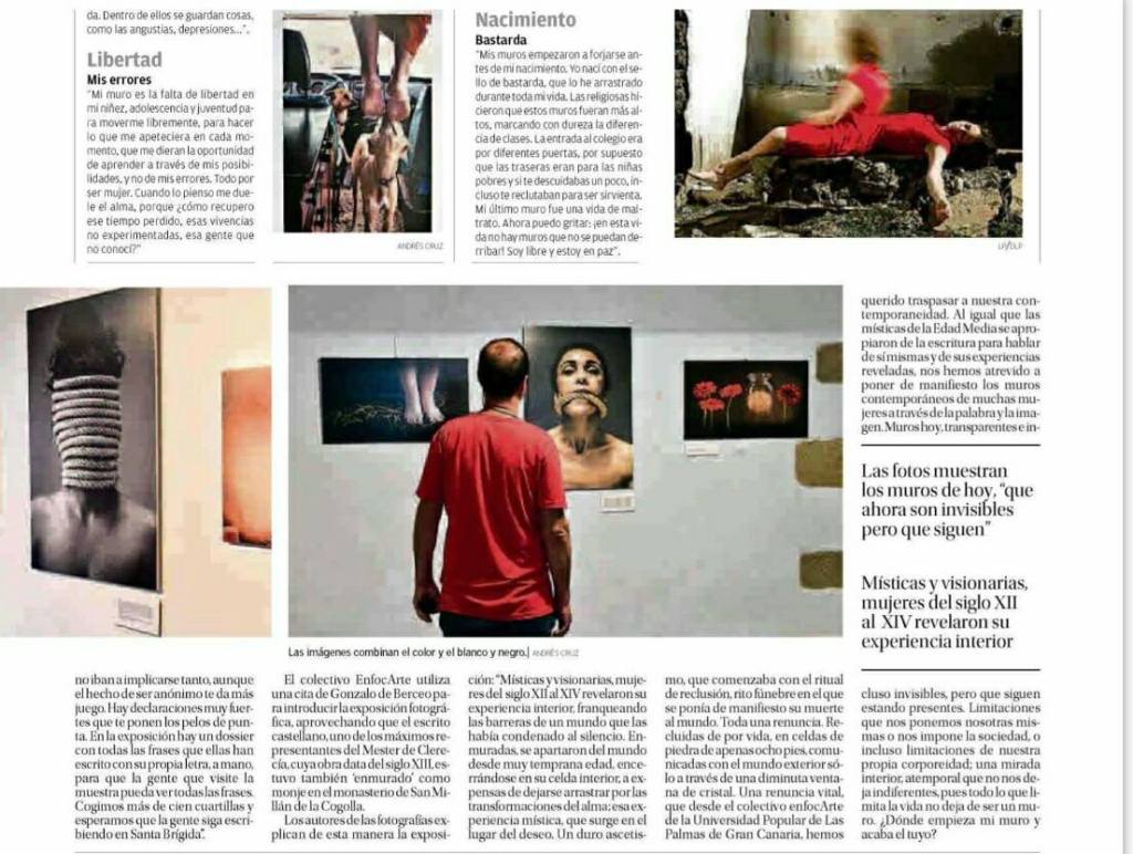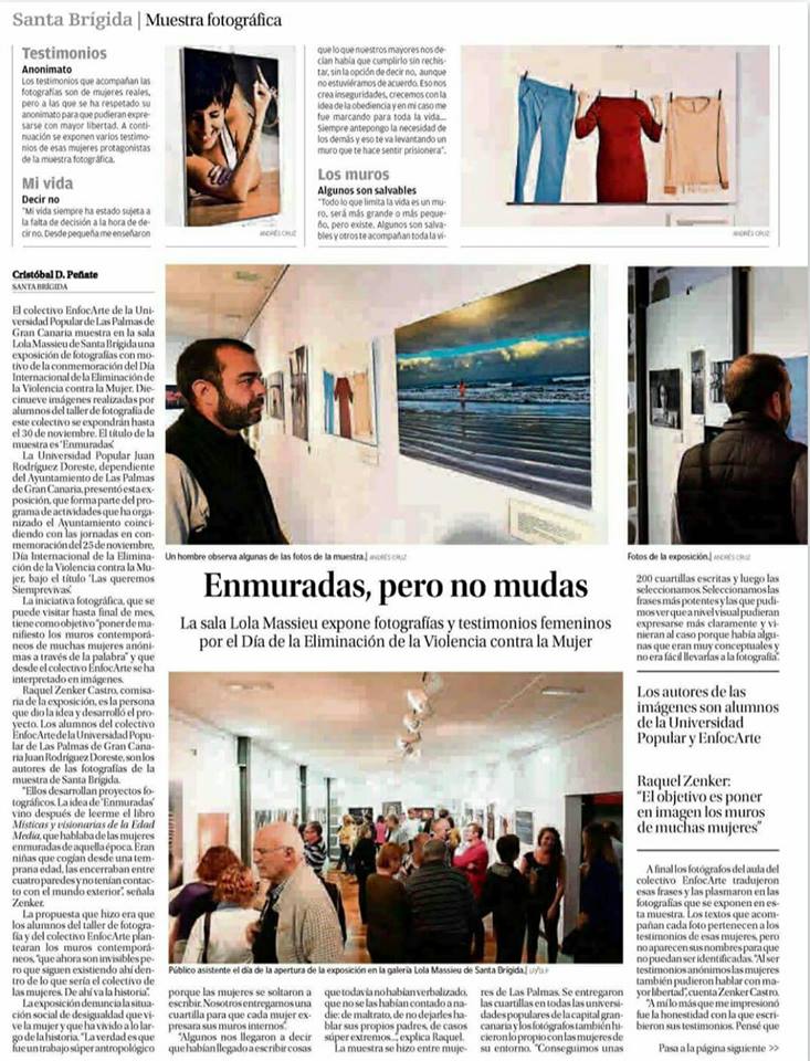 El 11 de noviembre de 2016 el colectivo enfocArte inauguró la propuesta expositiva Enmuradas en la sala Lola Massieu de Santa Brígida. La exposición fue introducida de forma magistral por Chago Rodríguez, quien representó una pieza de danza contemporánea expresamente creada por él para esta ocasión. Nuestro especial agradecimiento a él y también a la Concejalía de Igualdad de Santa Brígida y a Rosalía Rodríguez Alemán por su invitación para exponer nuestra obra y por el exquisito trato que recibimos.
