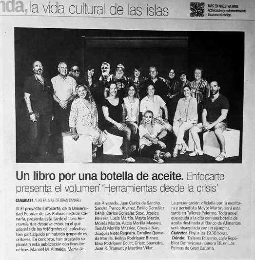 Al cumplirse una década desde que comenzamos a convivir con la palabra crisis rotulada en nuestras espaldas, desde el colectivo enfocArte quisimos compartir esa búsqueda de herramientas olvidadas junto a la generosidad de la palabra de veinte escritores y escritoras de Las Palmas de Gran Canaria.